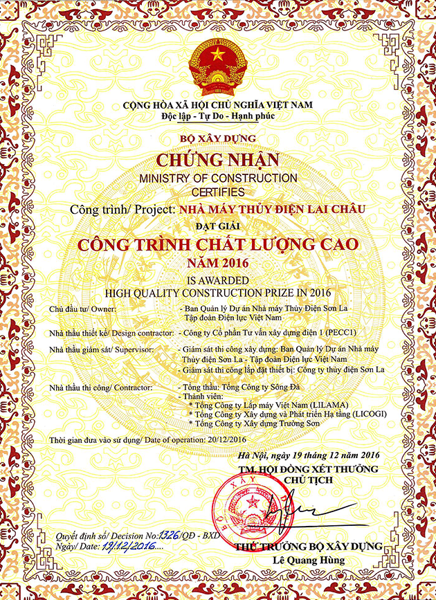 - Thuỷ điện Huội Quảng: do EVNPECC1 làm Tư vấn (TVTK và TVGS) đạt “Giải thành tựu ” được trao bởi Hiệp hội các Kỹ sư tư vấn quốc tế - FIDIC năm 2018.