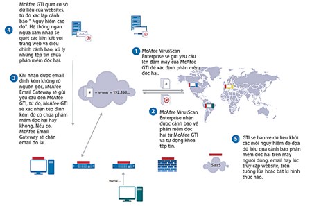 Để giúp người dùng, đặc biệt là các doanh nghiệp, có thể tham gia đánh giá mức độ tin cậy của các trang web mình ghé thăm, các thông tin mình truy cập, công nghệ Global Threat Intelligence (GTI) at Work đă ra đời (Xem hình).