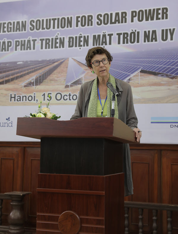 Mở đầu Hội thảo, bà Grete Løchen – quyền Đại sứ Na Uy tại Việt Nam cho biết: từ Hội nghị Biến đổi khí hậu của Liên hợp quốc tại Paris năm 2015, thế giới đã đi đến những thách thức thông qua 17 mục tiêu phát triển bền vững toàn cầu và Na Uy mong muốn đóng góp vào làm quá trình phát triển trong tương lai của chúng ta bền vững hơn. Ba mục tiêu về “Hành động khí hậu”, “Cuộc sống dưới nước” và “Cuộc sống trên bờ” đã đưa ra một thách thức lớn đó là phải giảm một nửa khí thải CO2 từ việc phát triển kinh tế, đây chính là chìa khóa để đạt tới sự thành công các mục tiêu của chương trình nghị sự năm 2030 của Liên Hợp quốc. Trên cơ sở đó, bà quyền Đại sứ rất vui khi được chứng kiến sự phát triển tích cực hiện nay về khung pháp lý để hỗ trợ thị trường điện mặt trời tại Việt Nam. Bà Grete Løchen hy vọng, các công ty Na Uy có mặt tại buổi Hội thảo có thể tìm kiếm được cơ hội hợp tác với đối tác Việt Nam để phát triển các dự án điện mặt trời tại Việt Nam.